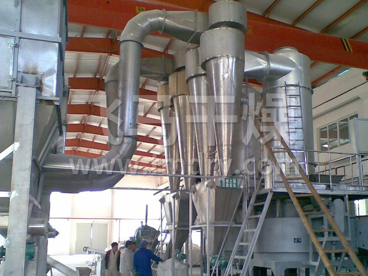 热空气由进风口以适宜的喷动速度从干燥机底部进入搅拌粉碎干燥室,对物料强烈的剪切、吹浮、旋转作用,于是物料受到离心、剪切、碰撞、磨擦而被微粒化,强化了传质传热。在干燥机底部,较大较湿颗粒团在搅拌器的作用下被机械破碎,湿含量较低、颗粒度较小的颗粒被旋转气流夹带上升,在上升的过程中进一步干燥,由于气固相作旋转流动,固相惯性大于气相,固气两相间的相对速度较大,强化两相间的传热效果,所以该机干燥强度高。