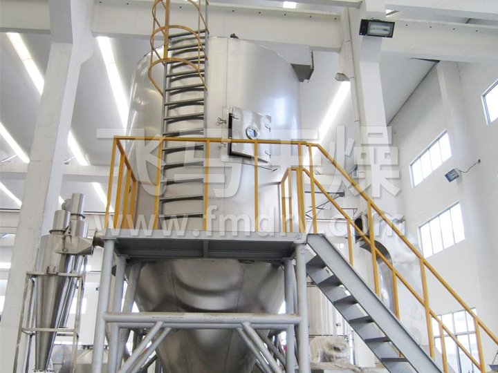 该机采用全封闭形式,所有部件均采用不锈钢制造,配有三级净化装置,过滤后的空气达十万级要求。筒体与顶部装有冷壁装置,使壁温<80℃,干燥塔内装有气刷扫塔装置。经该机干燥后的中药浸膏粉,不会出现焦化变质现象,大大增加了收粉率(95%以上),而且不会产生混药现象和粘壁现象。